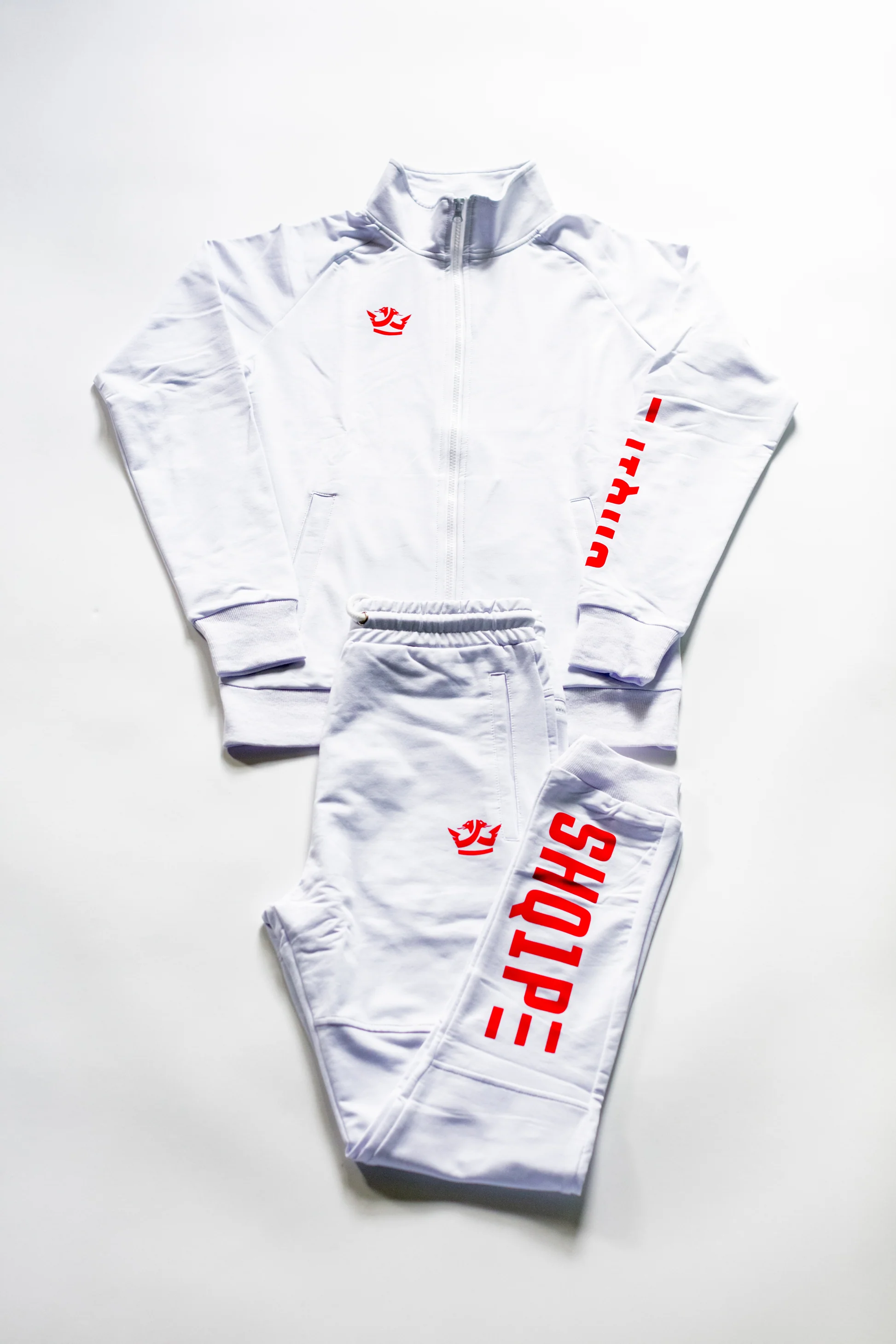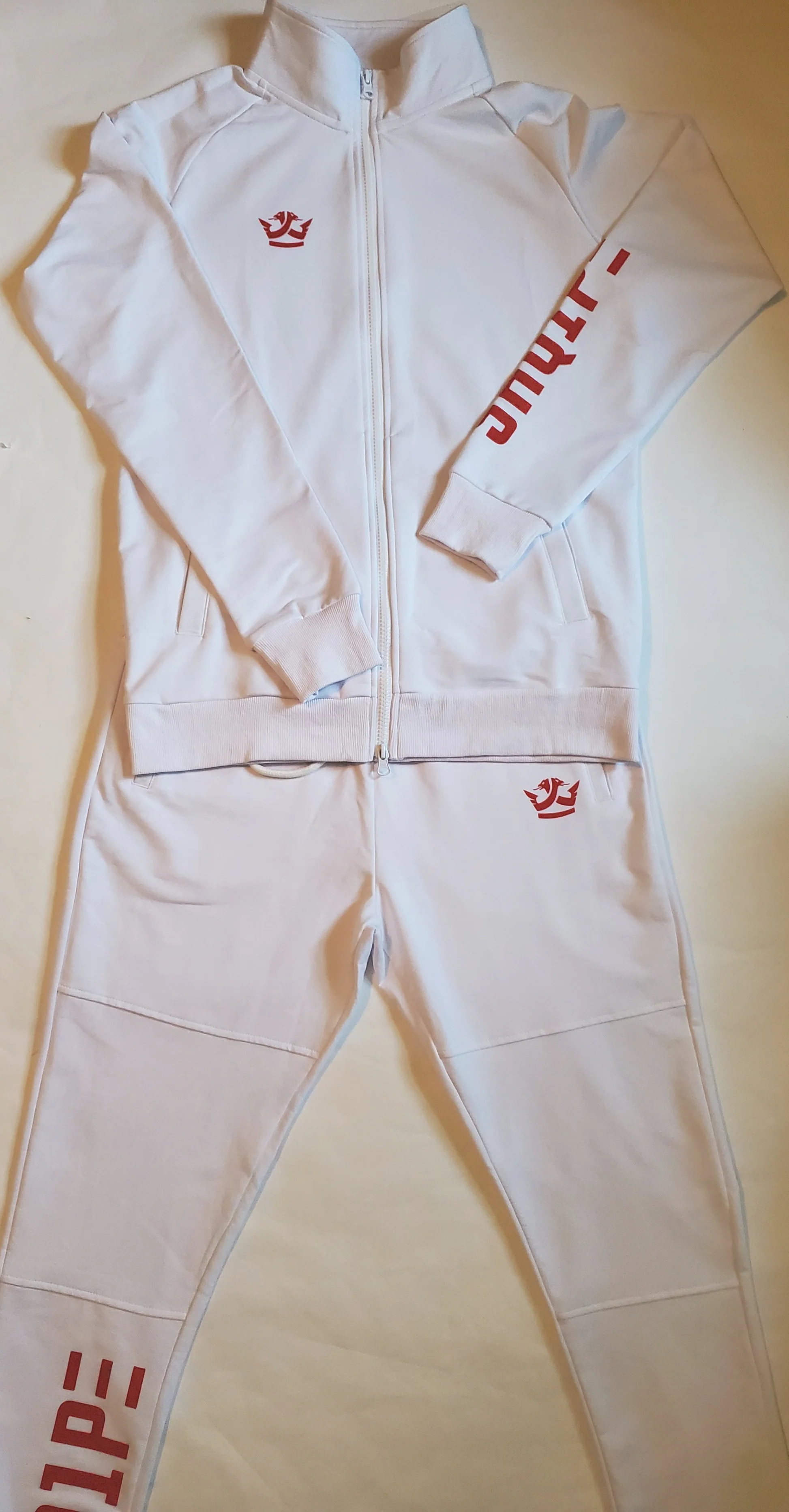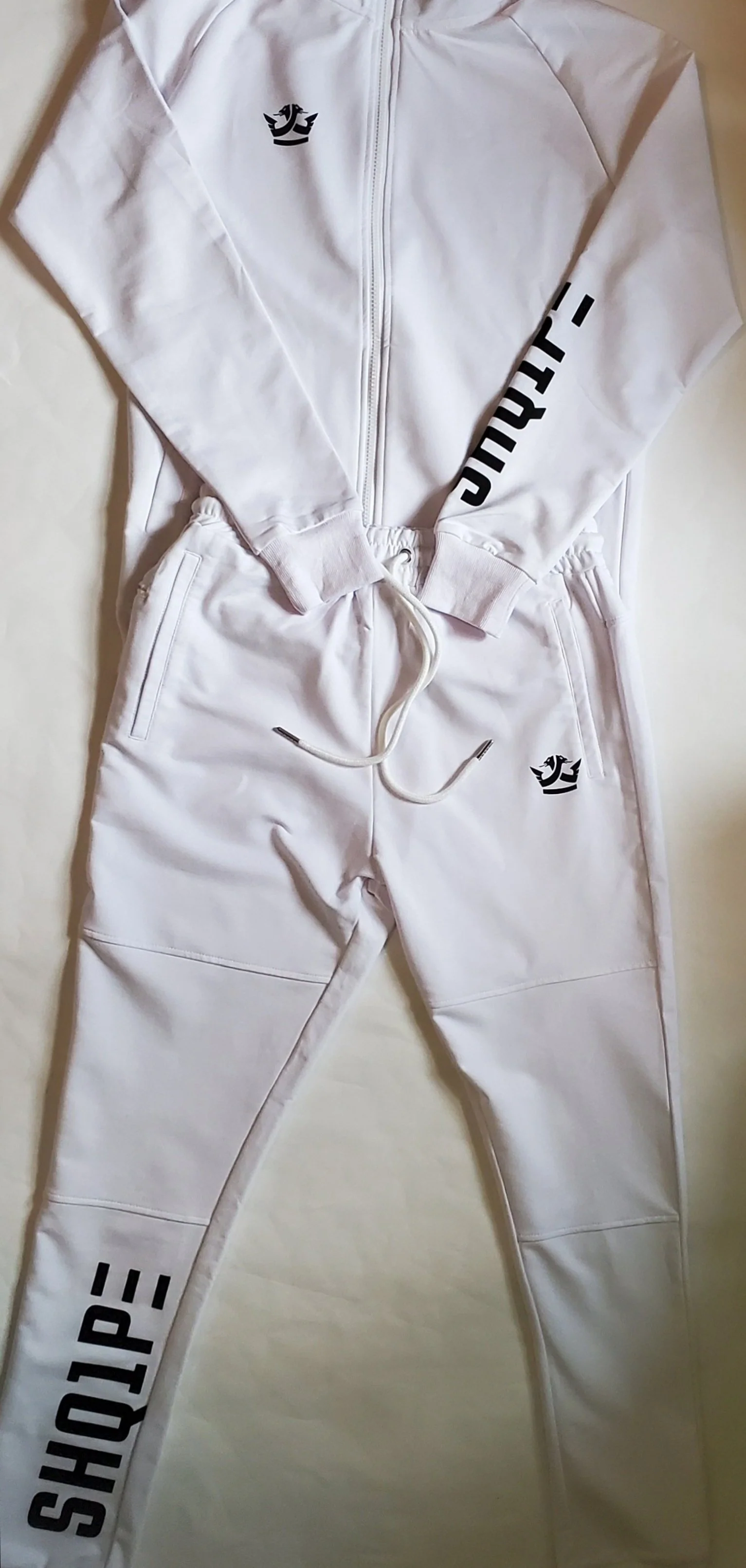 Streetwear full tracksuit in white color with black logo. Logo reflects in light this tracksuit is made of soft, moisture-wicking fabric to keep you dry and comfortable.